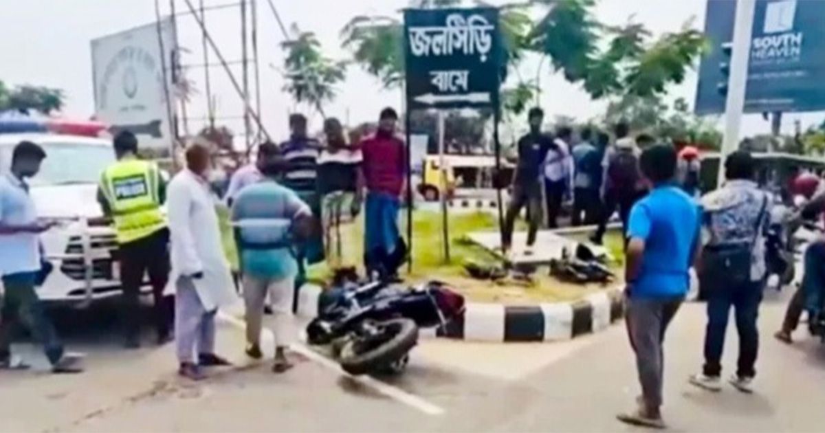মোটরসাইকেল আরোহী দুই বন্ধু রিফাত হাসান ও সাব্বির আহমেদ ছিটকে সড়কের উপর পড়ে